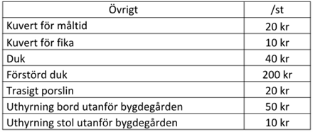 - Förstörd duk och trasigt porslin ska ersättas enligt gällande prislista.