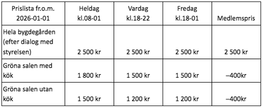 Uthyrning av bord och stolar för verksamhet utanför bygdegården, dvs om bygdegården inte är bokad, görs endast till medlemmar enligt prislista.